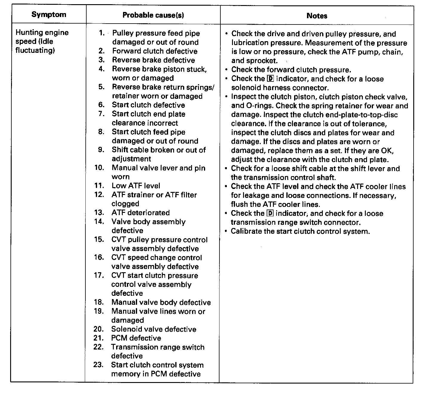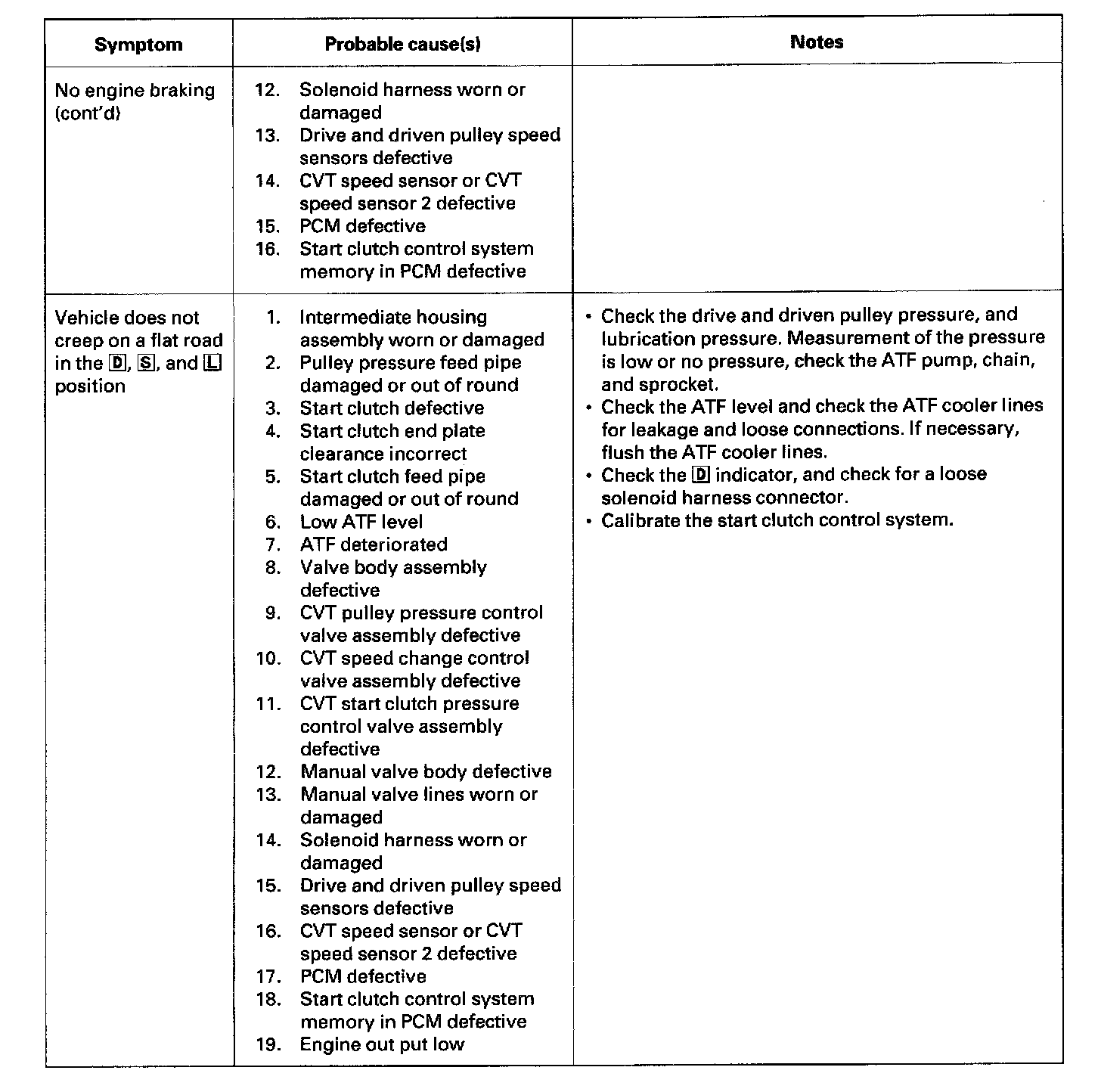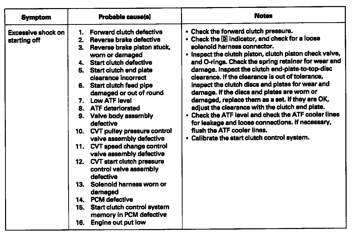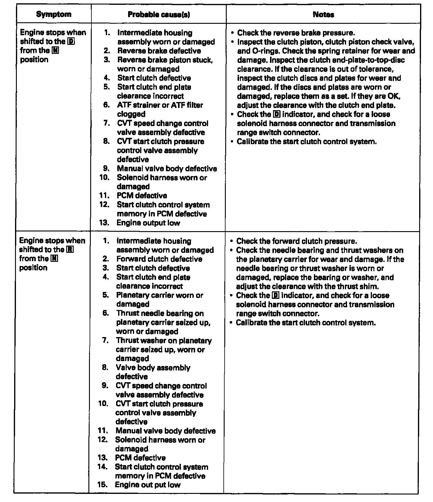 These symptoms DO NOT trigger diagnostic trouble codes (DTCs) or cause the D indicator to blink. If the malfunction indicator lamp (MIL) was reported ON or the D indicator light has been blinking, check for DTCs. If the vehicle has one of the symptoms in the following chart, check the probable cause(s) for it. In the sequence listed, until you find the problem.