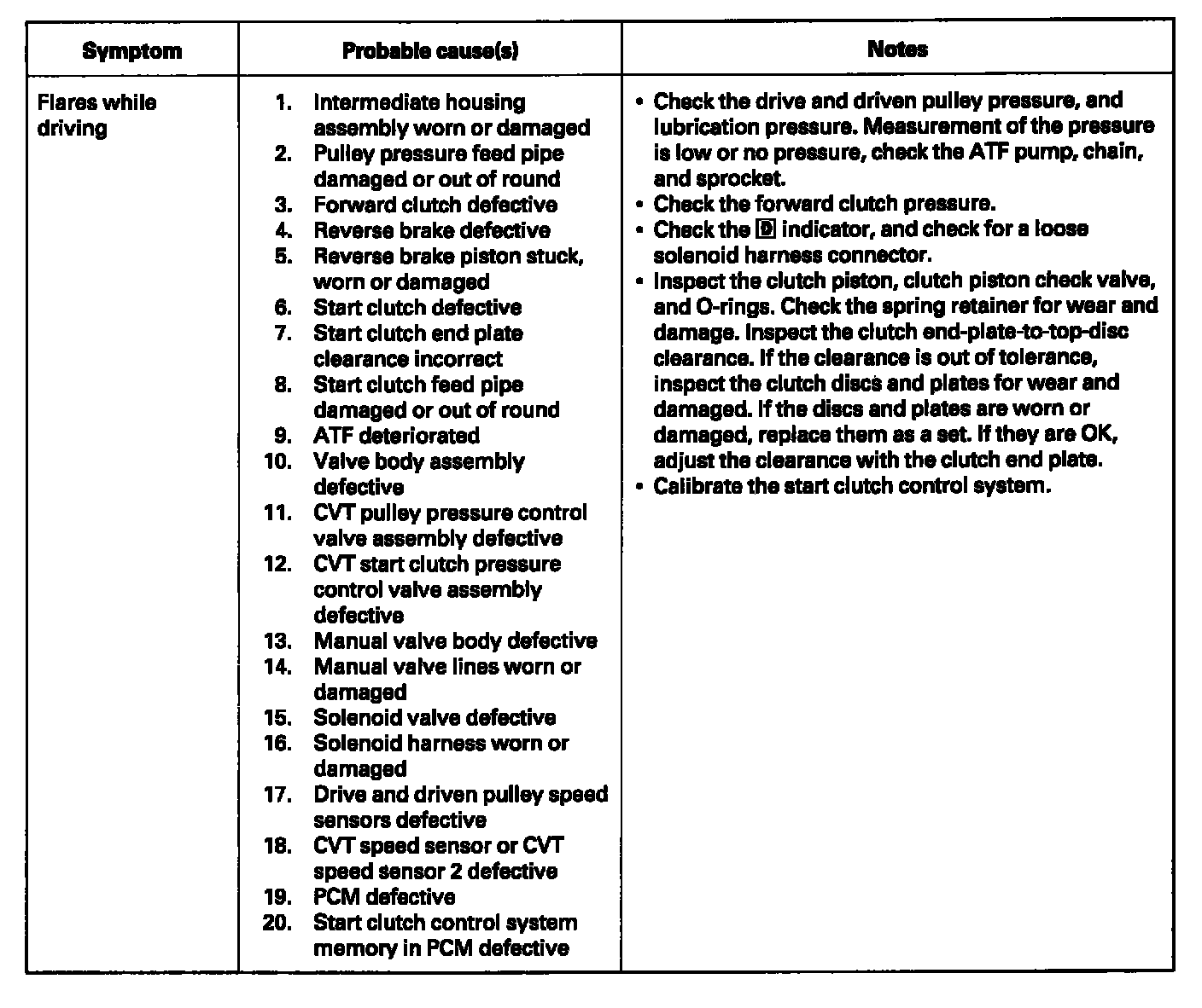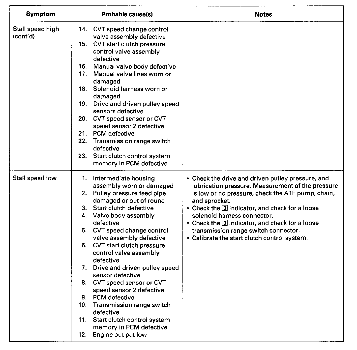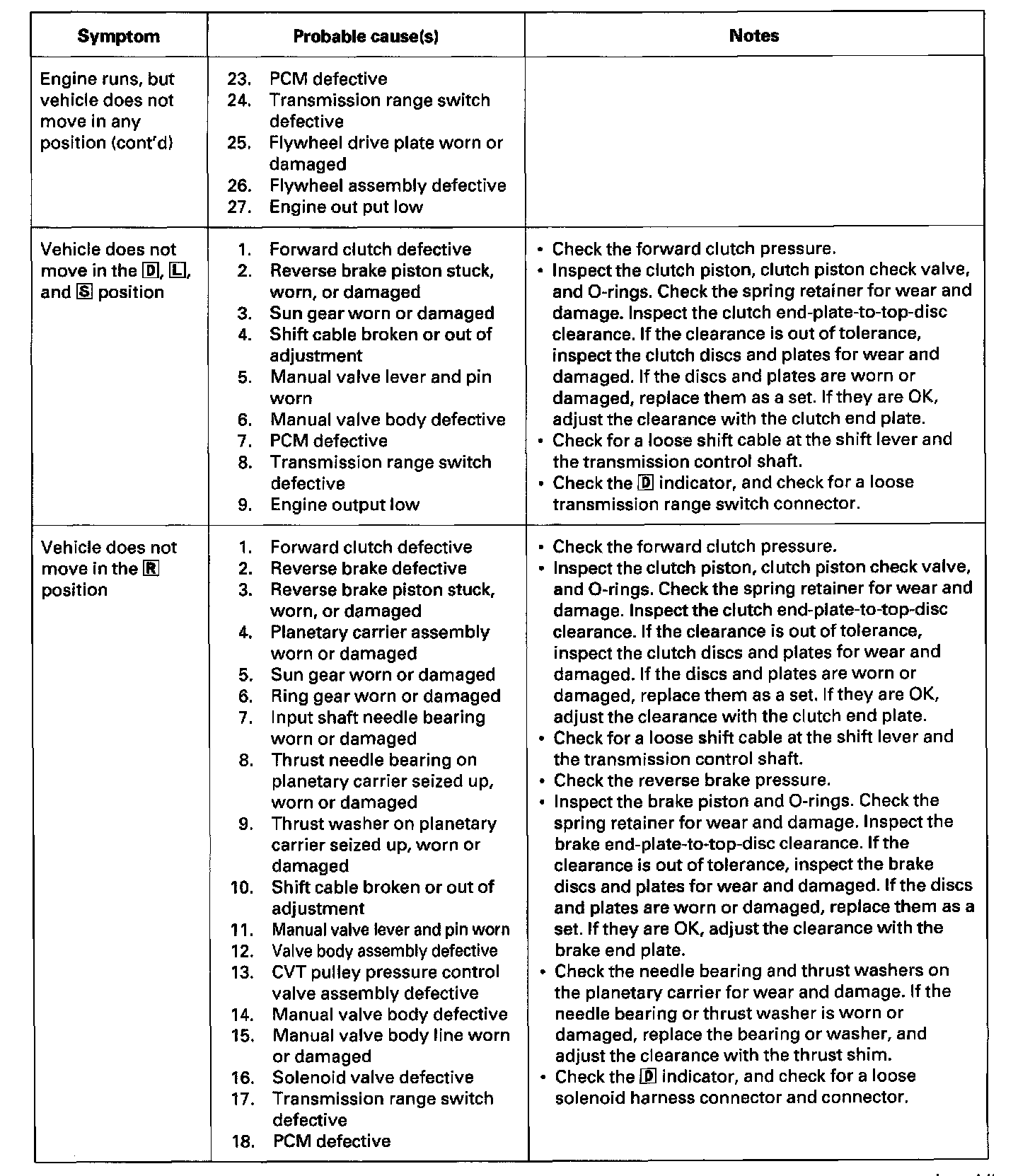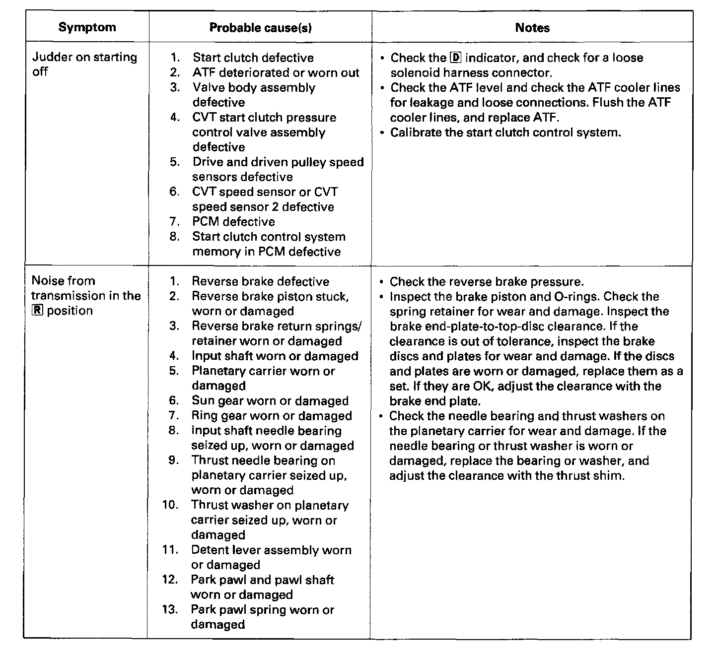 These symptoms DO NOT trigger diagnostic trouble codes (DTCs) or cause the D indicator to blink. If the malfunction indicator lamp (MIL) was reported ON or the D indicator light has been blinking, check for DTCs. If the vehicle has one of the symptoms in the following chart, check the probable cause(s) for it. In the sequence listed, until you find the problem.