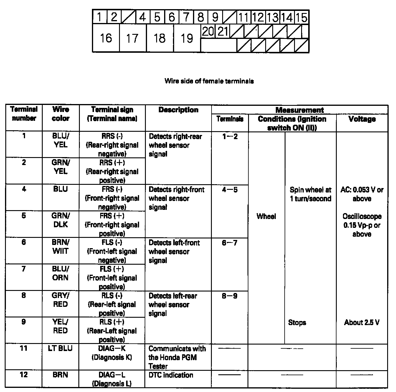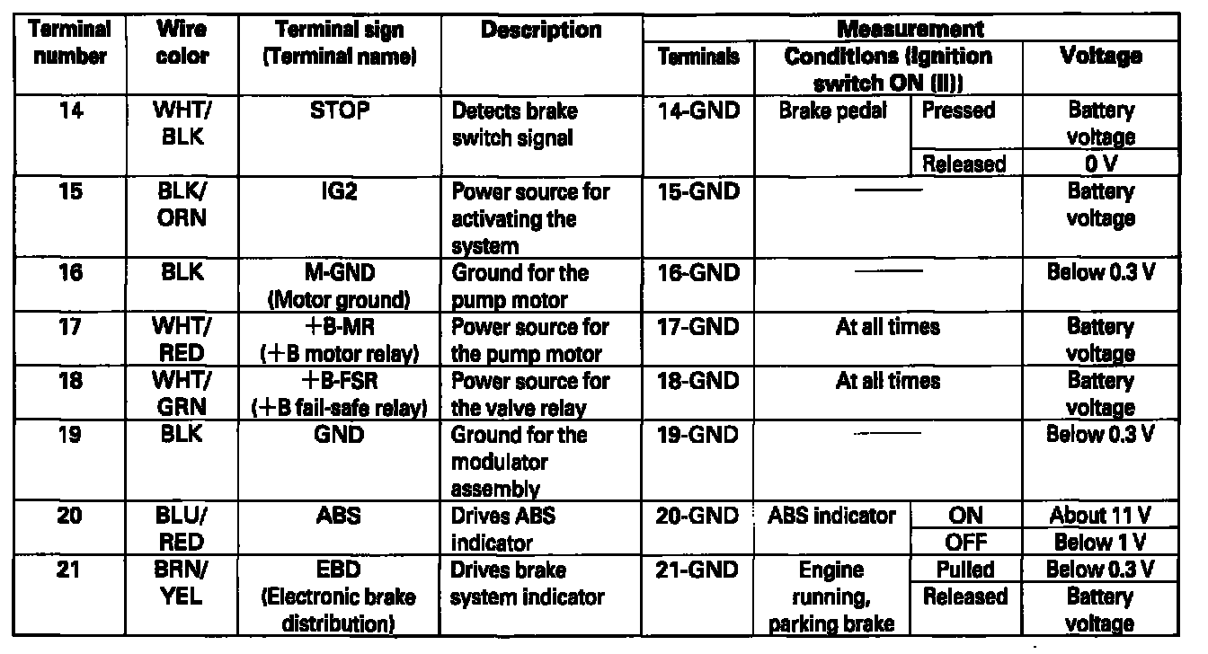 ABS Control Unit Inputs and Outputs for 31P Connector