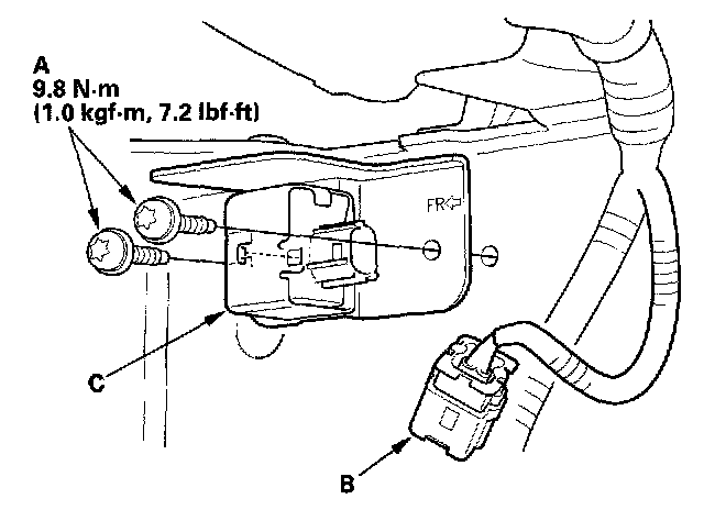 1. Install the new front impact sensor with new Torx bolts (A), then connect the engine compartment wire harness 2P connector (B) to the front sensor (C).