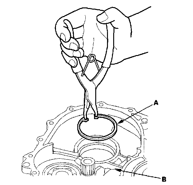 1. Install the 80 mm set ring (A) in the transmission housing (B).
