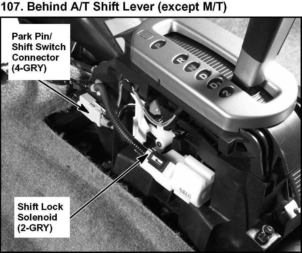 107. Behind A/T Shift Lever (except M/T):