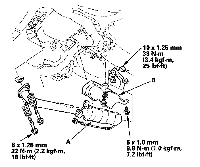 6. Disconnect the third HO2S connector, and remove the exhaust pipe A and the heat shield (B).