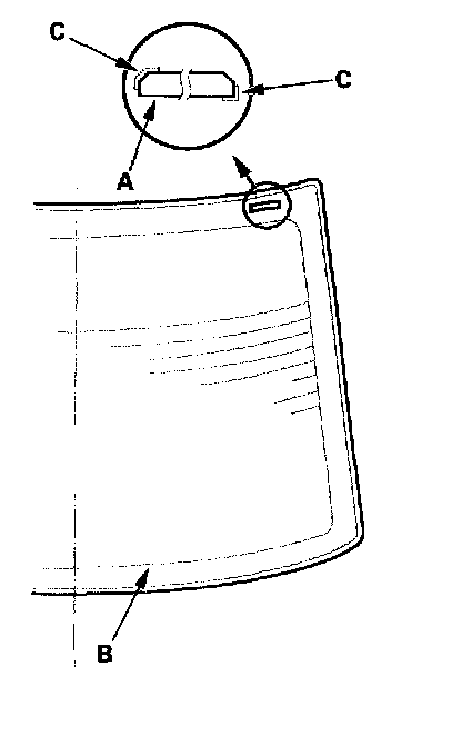 13. Set the rear window in the opening, and center it. Make alignment marks (A) across the rear window and body with a grease pencil at the four points shown. Be careful not to touch the rear window where adhesive will be applied.