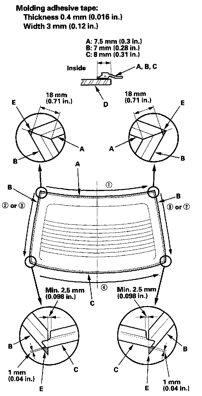 13. Attach the upper molding (A), side moldings (B), and lower molding (C) with adhesive tape around the edge of the rear window (D):