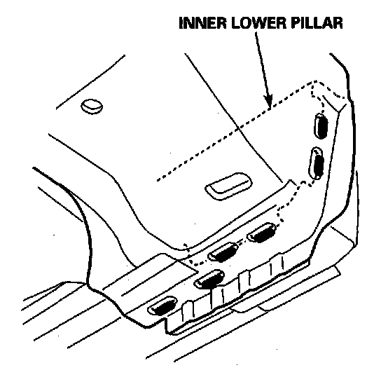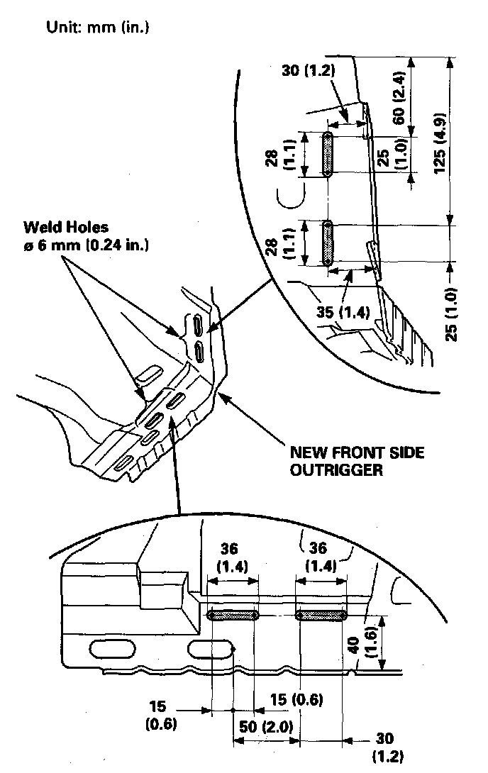 1. Drill the plug weld holes in the new front side outrigger for welding the front inner lower pillar.