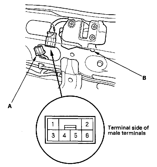 2. Disconnect the 6P connector (A) from the hatch lock actuator (B).