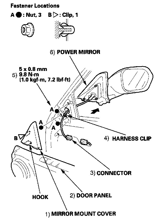 NOTE: To avoid scratching the door, be sure to hold the mirror while removing or installing the nuts.
