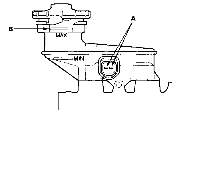 ^ Fill the reservoir with brake fluid to MAX (upper) level (B). With the float up, there should be no continuity.