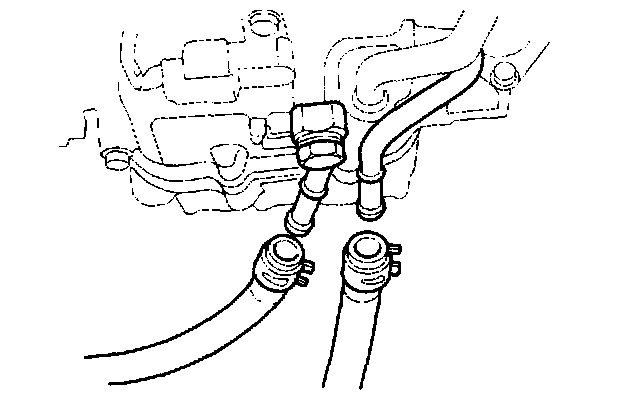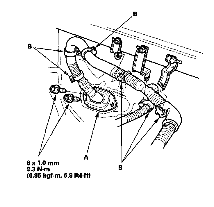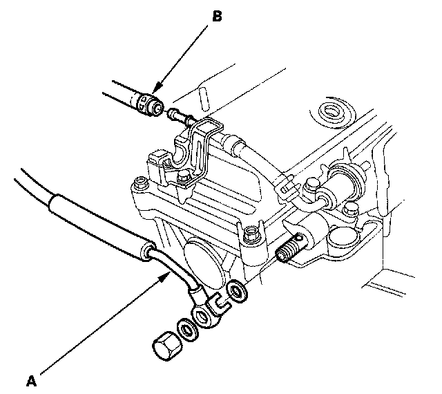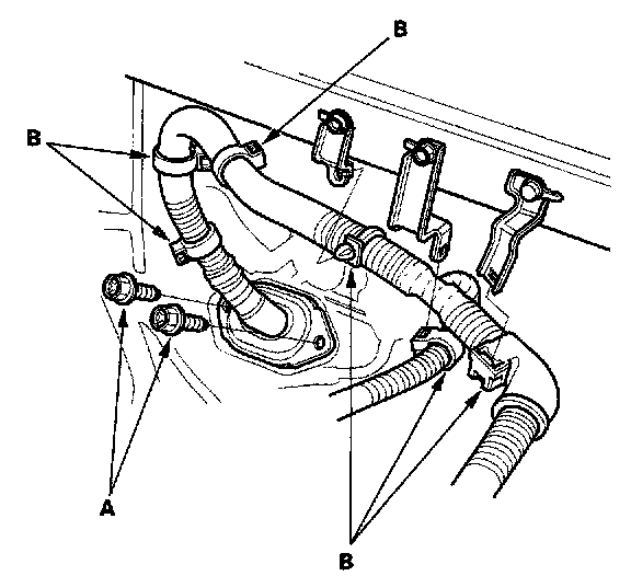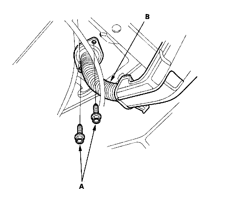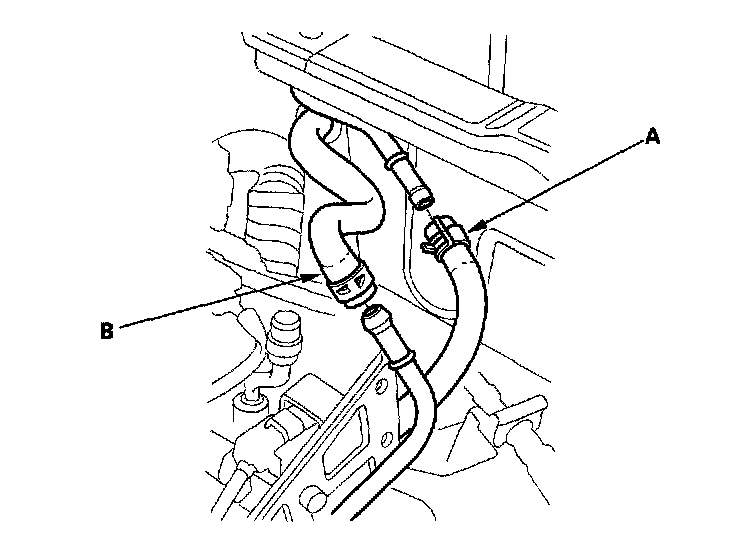 10. Remove the brake booster vacuum hose (A) and the evaporative emission (EVAP) control canister hose (B).