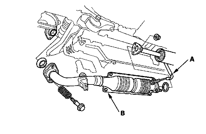 33. Disconnect the third heated oxygen sensor (third HO2S) connector (A) ('02-03 M/T models), then remove the NOX adsorptive three way catalyst (NOX adsorptive TWC) (B).