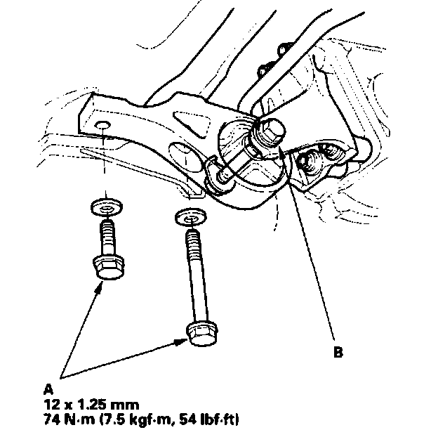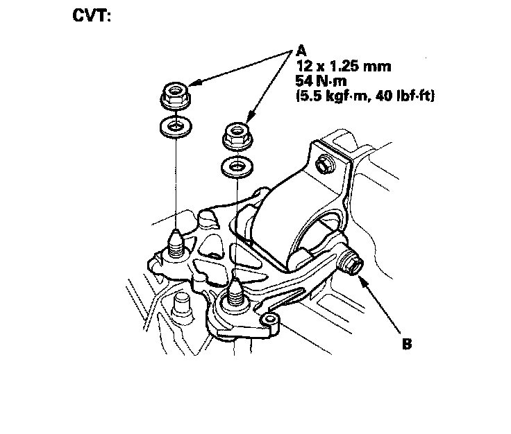 3. Tighten the transmission mount bracket mounting bolt/nuts (A), then loosen the transmission mount bolt (B).