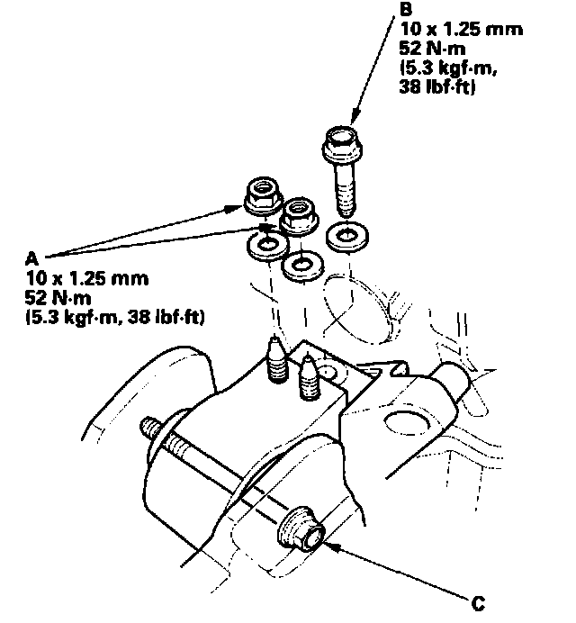 4. Tighten the side engine mount mounting nuts (A) and mounting bolt (B), then loosen the side engine mount bolt (C).