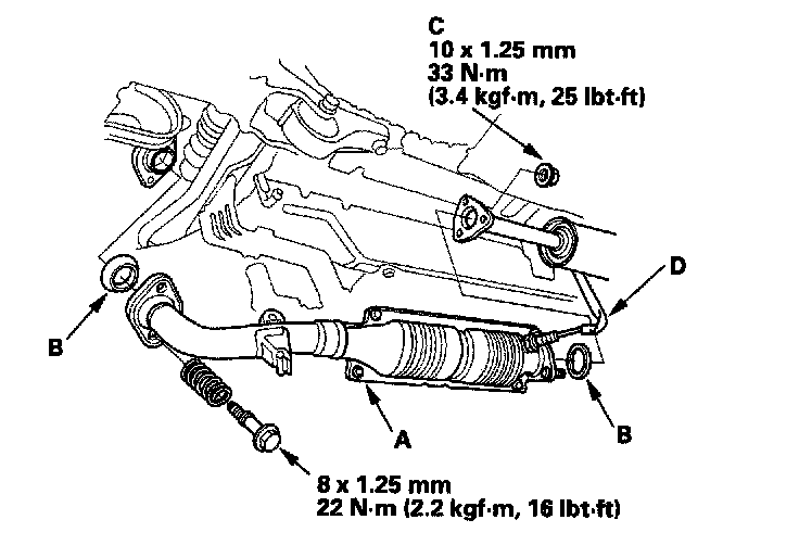 16. Install the NOX adsorptive three way catalyst (NOX adsorptive TWC) (A); use new gaskets (B) and new self-locking nuts (C), then connect the third heated oxygen sensor (third HO2S) connector (D) ('02 - 03 M/T models).