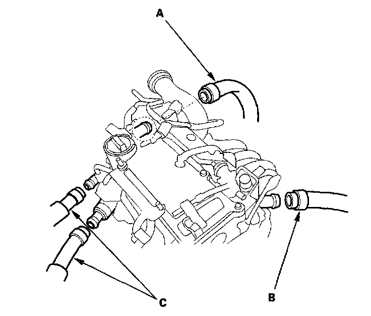 38. Remove the upper radiator hose (A), lower radiator hose (B), and heater hoses (C).