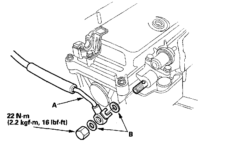 30. Install the fuel feed hose (A) with new washers (B).