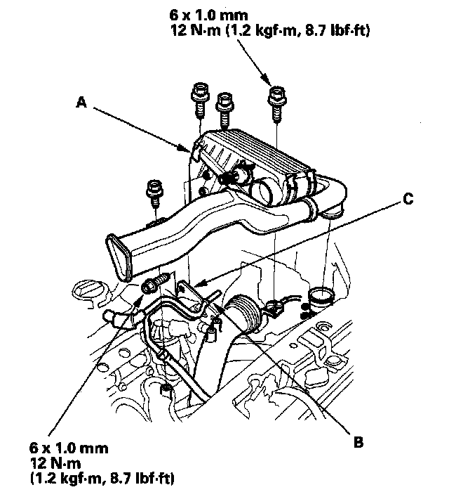8. Remove the breather pipe (A) and brake booster vacuum hose bracket (B) from the air cleaner housing, then remove the air cleaner housing/ intake air duct assembly (C).