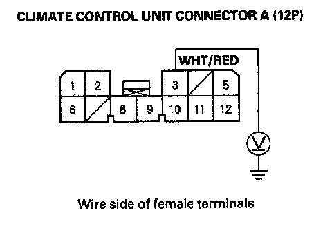 6. Measure the voltage between the No. 3 terminal of climate control unit connector A (12P) and body ground.