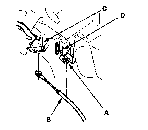 4. Attach the heater valve cable (B) to the air mix control linkage (C) as shown. Hold the end of the heater valve cable housing against the stop (D), then snap the heater valve cable housing into the cable clamp (A).
