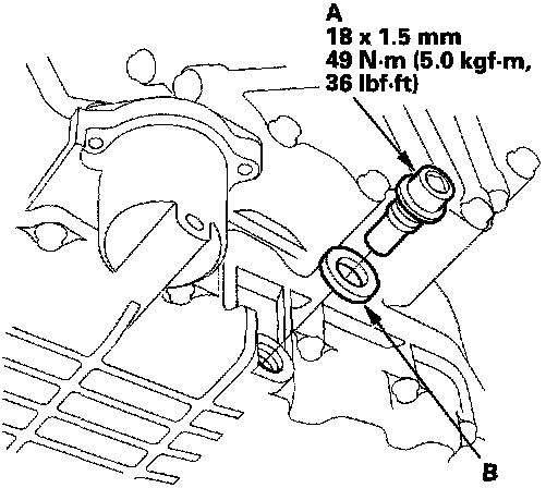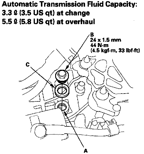 9. Install the ATF filler bolt (B) with a new sealing washer (C).