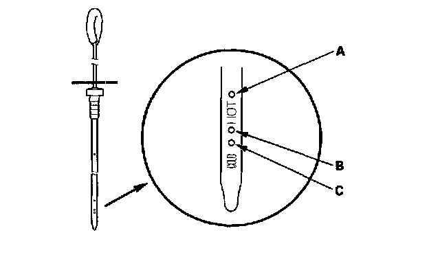 8. Check that the fluid level is between the upper mark (B) and lower mark (C) on the COLD portion of the gauge.