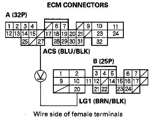 4. Measure voltage between ECM connector terminals A27 and B20.