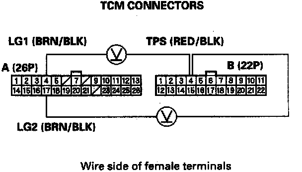 7. Connect a digital multimeter (A) and the special tools (B) to check voltage between TCM connector terminals B4 and A4 or A17.