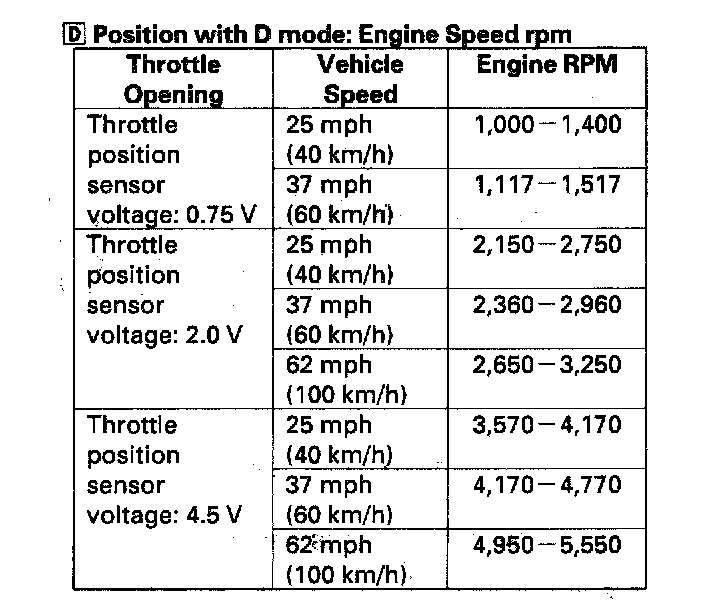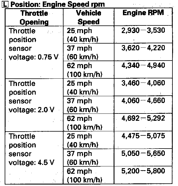 8. Test-drive the vehicle on a flat road in the position shown. While driving, check that the engine speeds meet the approximate vehicle speeds shown in the table.