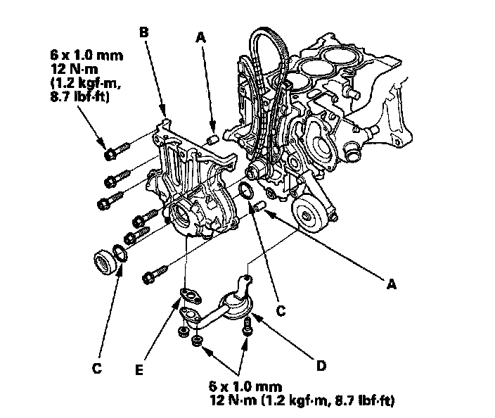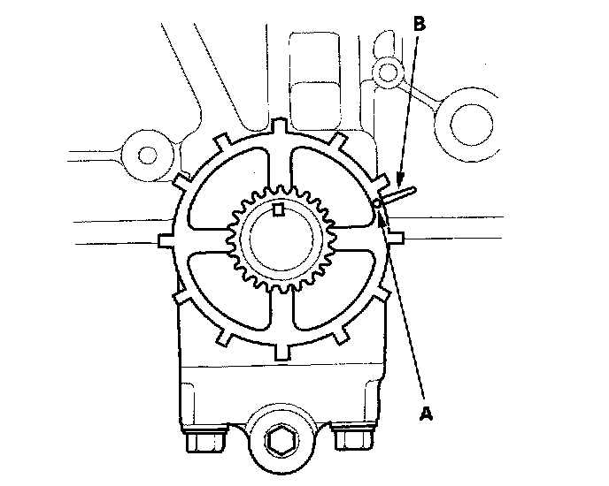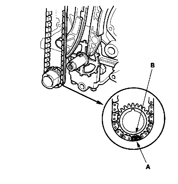 (A) Install the cam chain with the colored piece (A) align with punch mark (B) on the crankshaft sprocket