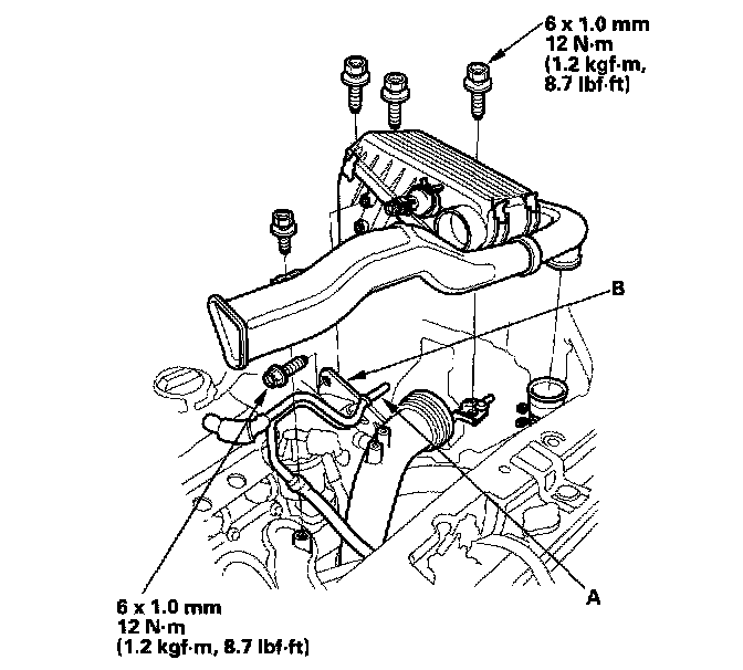 3. Remove the breather pipe (A) and brake booster vacuum hose bracket (B) from the air cleaner housing, then remove the air cleaner housing/intake air duct assembly.