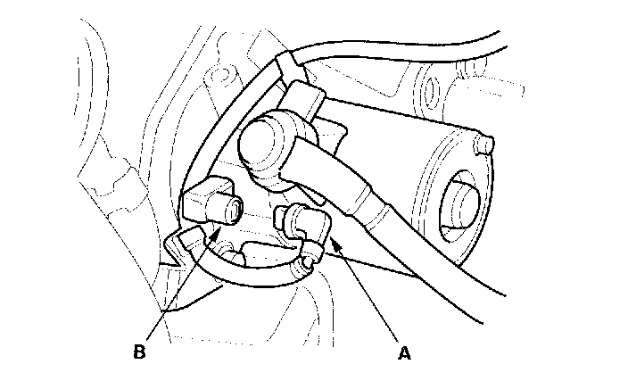 6. Make sure the transmission is in neutral, then disconnect the BLK/WHT wire (A) from the starter solenoid (B). Connect a jumper wire from the battery positive terminal to the solenoid terminal.