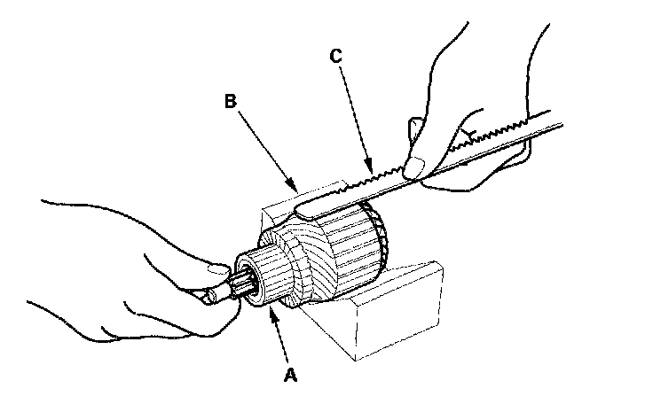 9. Place the armature (A) on an armature tester (B). Hold a hacksaw blade (C) on the armature core. If the blade is attracted to the core or vibrates while the core is turned, the armature is shorted. Replace the armature.