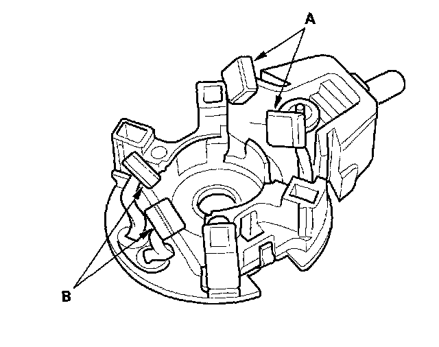 12. Check that there is no continuity between the (+) brush (A) and (-) brush (B). If there is continuity, replace the brush holder assembly.