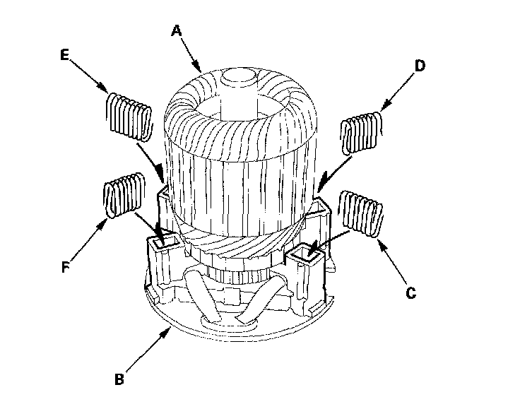 14. Squeezing a spring (C), insert it in the hole on the brush holder and push it until it bottoms. Repeat this for other three springs (D, E and F).