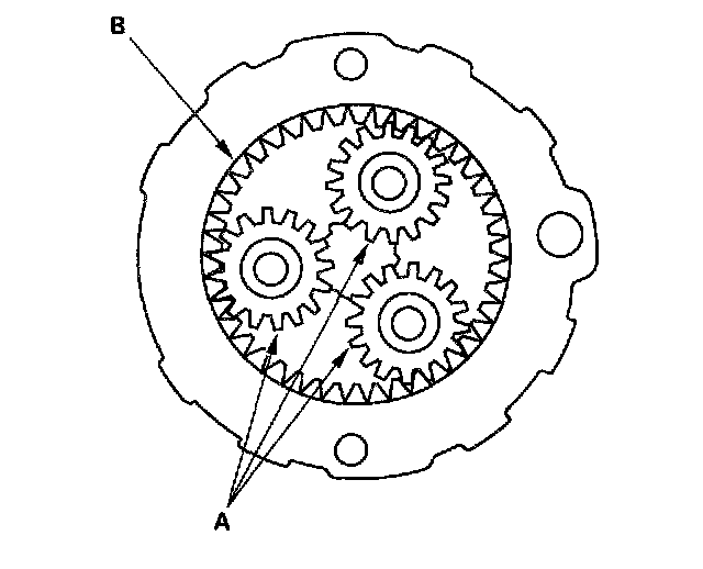 16. Check the planetary gears (A) and ring gear (B) are worn or damaged. If they are worn or damaged, replace the planetary gears and ring gear.