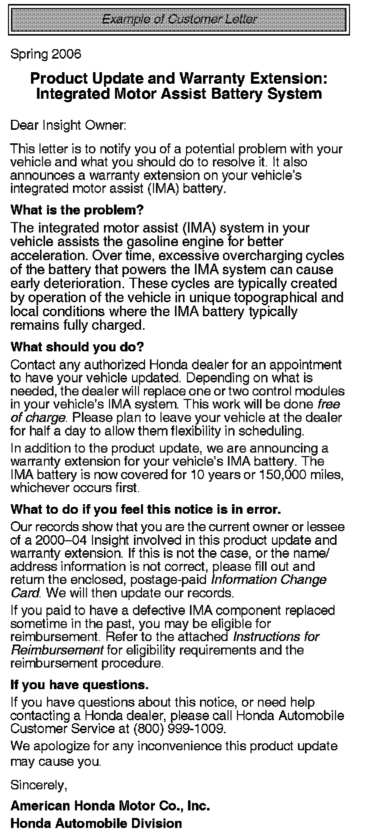 Campaign - Premature IMA Battery Module Failures