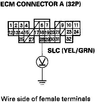 4. Measure the voltage between ECM connector terminal A28 and body ground.