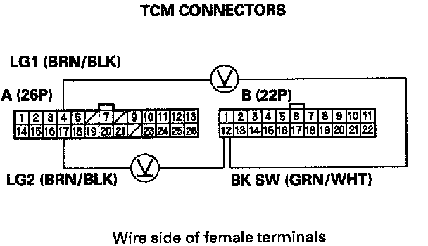 6. Press the brake pedal, and measure the voltage between TCM connector terminals B12 and A4 or A17.