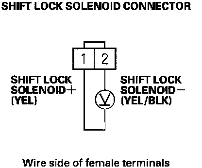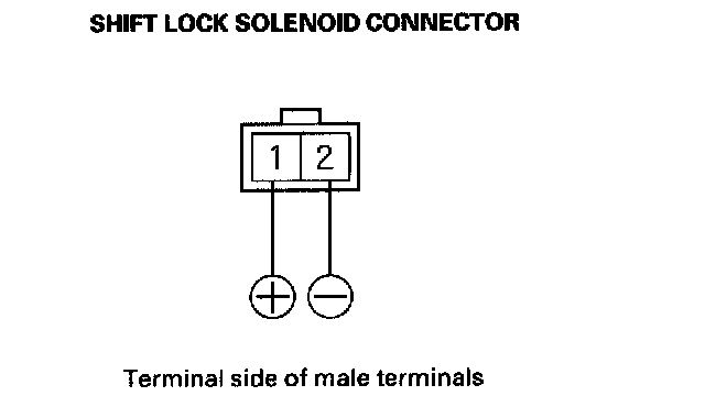 21. Connect the battery positive terminal to shift lock solenoid connector terminal No. 1, and connect the battery negative terminal to connector terminal No. 2. Do not connect the battery positive terminal to connector terminal No. 2 or you will damage the diode inside the shift lock solenoid.