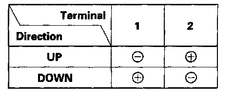 2. Run the motor by connecting power and ground to the No. 1 and No. 2 terminals. The ohmmeter needle should move back and forth alternately. If it does not, replace the driver's power window motor.