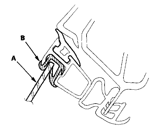6. Raise the glass fully, and check for gaps. Check that the glass (A) contacts the glass run channel (B) evenly.