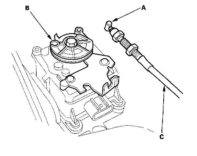 2. Disconnect the actuator cable end (A) from the output linkage (B), and remove the cable (C) from the cruise control actuator.