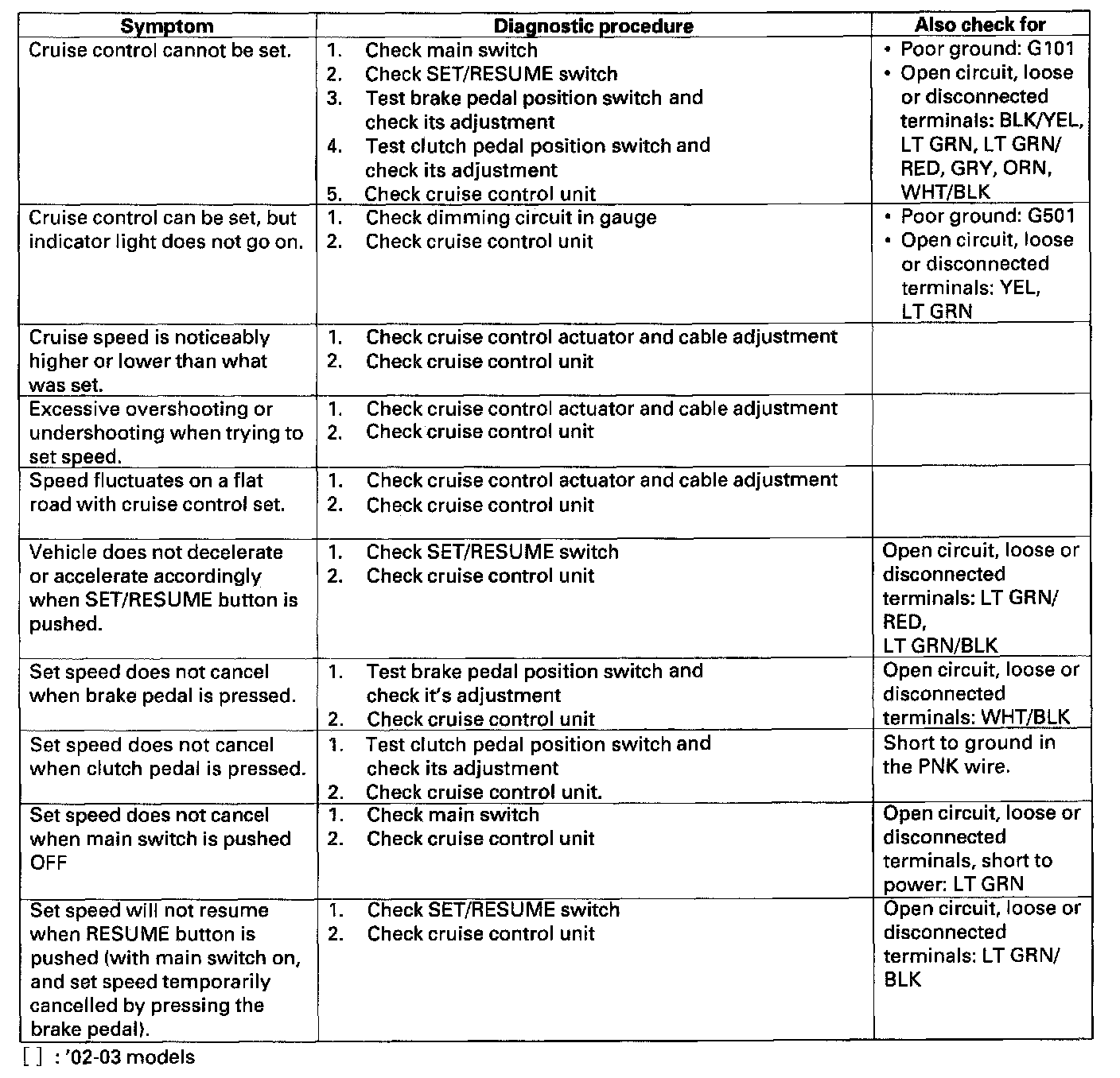 - The numbers in the table show the troubleshooting sequence.