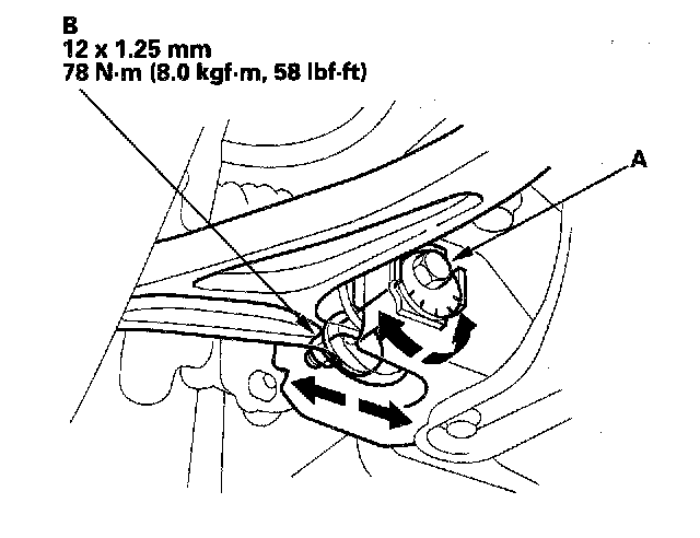 2. Hold the adjusting bolt (A) on the control arm, and loosen the self-locking nut (B).