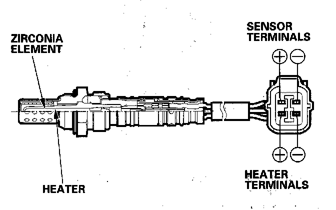 The heated oxygen sensors detect the oxygen content in the exhaust gas, then sends a signal to the ECM which varies the duration of injection accordingly. To stabilize its output, the sensors have an internal heater. The primary sensor is installed in the exhaust pipe. The secondary sensor is installed in the TWC.