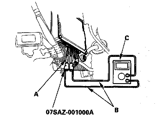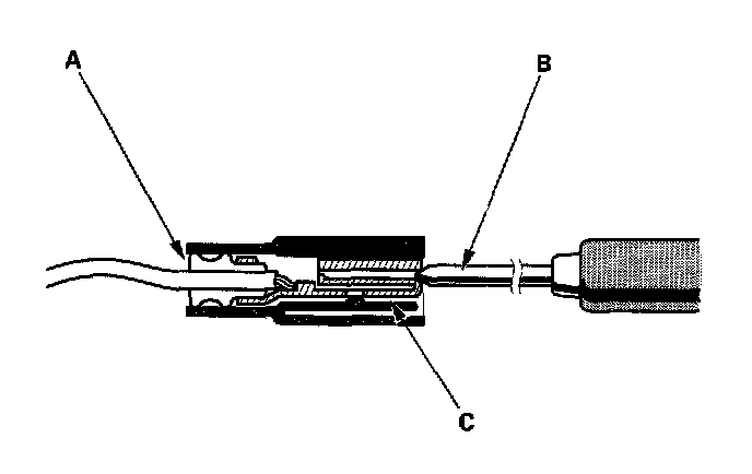 3. If you cannot get to the wire side of the connector or the wire side is sealed (A), disconnect the connector and touch the tester probe (B) to terminals (C) from the terminal side. Do not force the probe into the connector.