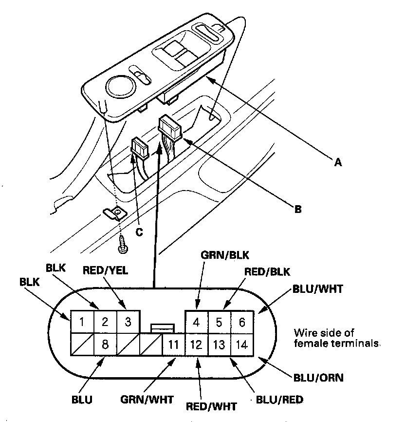 3. Disconnect the 14P connector (B) and the 10P connector (C) from the power window master switch.
