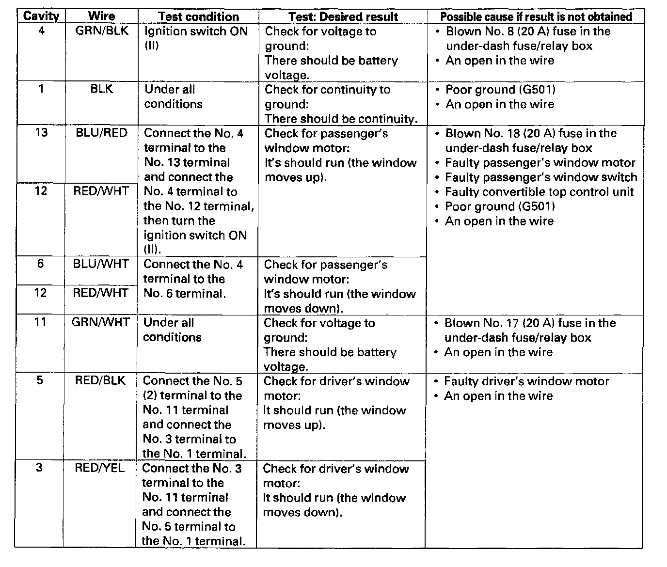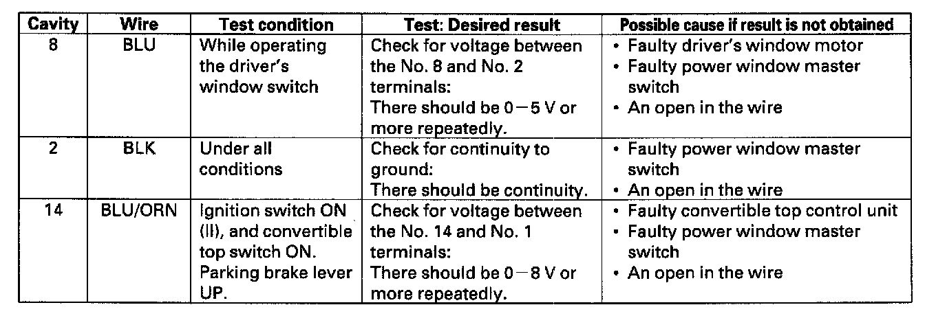7. If all the input tests prove OK, the power window master switch must be faulty; replace it.