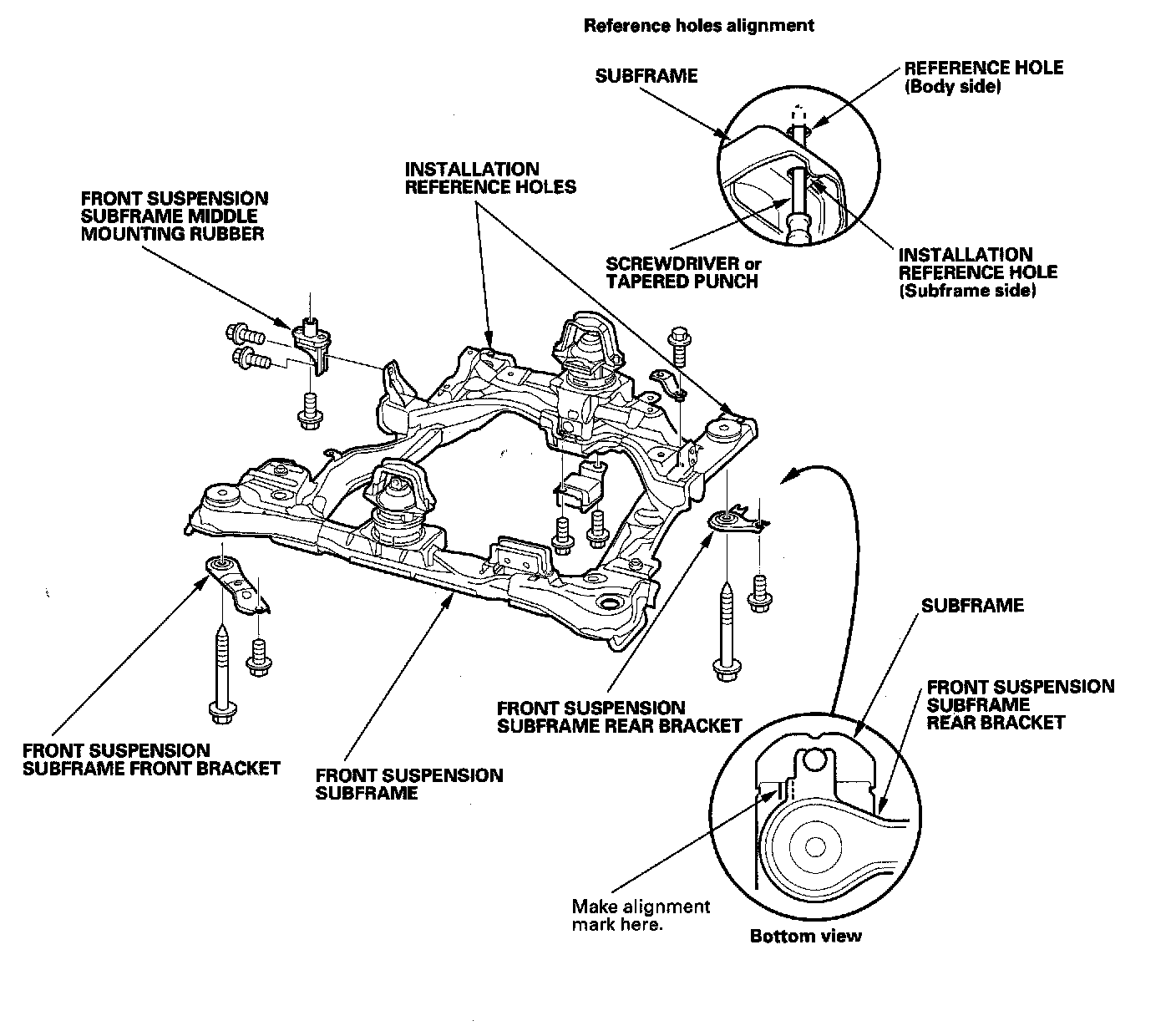 - Before removing the subframe, make an alignment mark for the front suspension subframe rear bracket as shown.