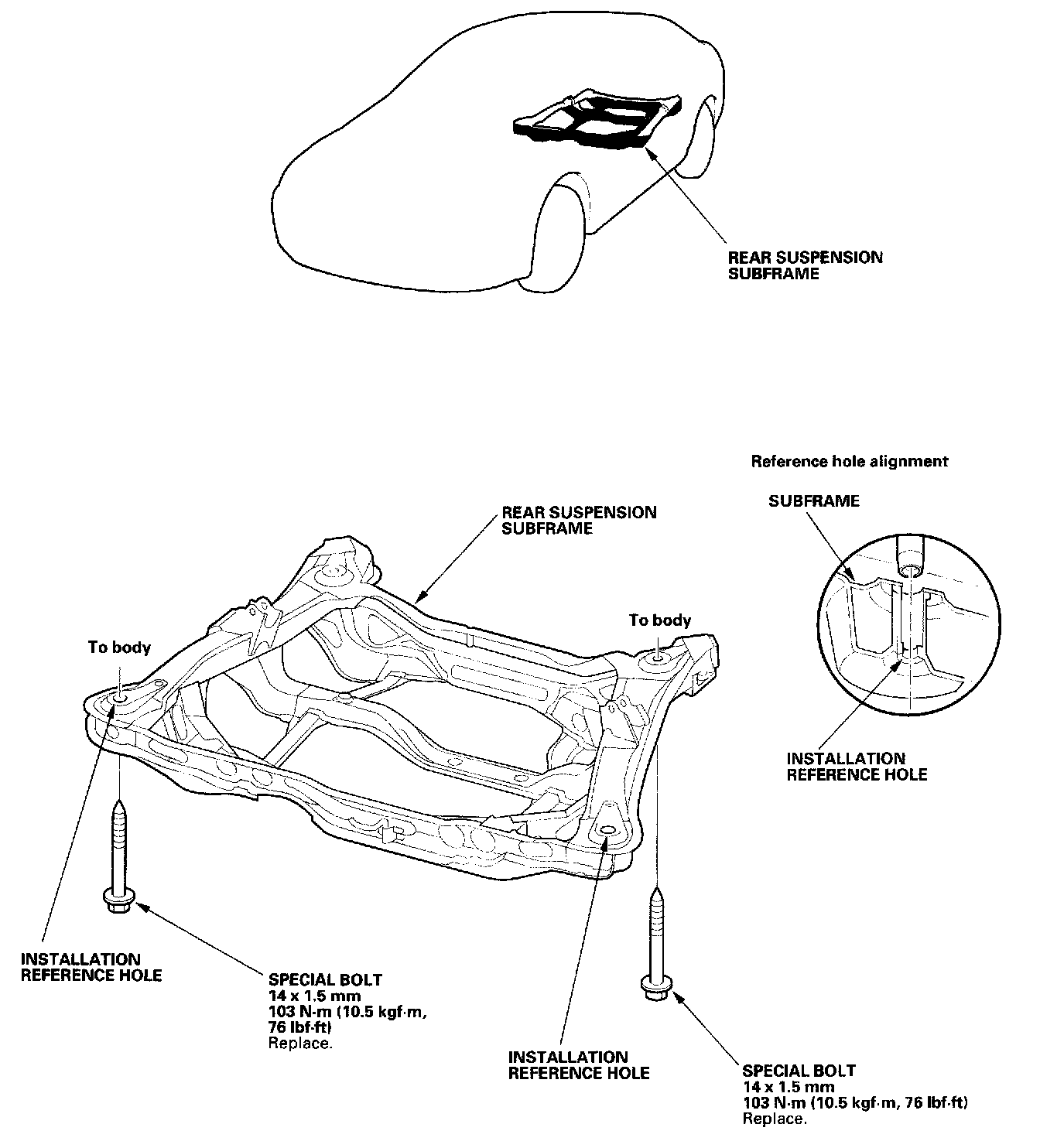 After removing the subframe mounting bolts, be sure to replace them with new ones.